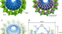 Crystal structures of the Hcp hexamer and of the VgrG trimeric spike revealed part of the building blocks of tailed phages, R-type pyocins, and T6SSs are structurally similar and led to the hypothesis that these nanomachines are evolutionary and functionally related11,12,13,14,15,16,17. These findings were reinforced upon determination of cryo-electron microscopy (cryoEM) and cryo-electron tomography structures of the TssB–TssC sheath in the contracted and extended states, which provided insights into the mechanism associated with effector delivery to recipient cells and subsequent recycling of the T6SS needle18,19,20,21. High-resolution crystal structures of isolated domains in combination with low-resolution electron microscopy studies also provided a glimpse of the TssJ–TssL–TssM membrane complex architecture that forms a fivefold symmetrical oligomer spanning the cell envelope22,23. This latter complex is evolutionary related to components of the type IVB secretion system (T4BSS) and demonstrates the mosaic origin of the T6SS apparatus6.