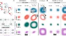 When the quarter-wave plates are adjusted so that the beams are circularly polarized with opposite handedness (CP) the electric field vectors of the beams rotate together, in the same sense, Fig. 1a. This has two effects. First, the weak focusing by the lens produces small, transverse components of pO through spin-orbit coupling27. Second, the inhomogeneous circular polarization generates transverse components of pS, which also circulate about the beam axis, Fig. 1b. For the quasi-paraxial beams used here, the various momentum decompositions are approximately equivalent, and the spin term is strongly dominant, with \(|{\mathrm{p}}_\phi ^{\mathrm{S}}/{\mathrm{p}}_\phi ^{\mathrm{O}}| \gtrsim (2kz_{\mathrm{R}}) \approx 300\) (Supplementary Note 1). These transverse momenta give rise to azimuthal forces, primarily associated with pS (Supplementary Note 2). In combination with the optical gradient forces, the circularly polarized trap has a cylindrically symmetric force field, \({\mathbf{F}}^{{\mathrm{opt}}} = F_{\phi} ^{{\mathrm{opt}}}{{\mathbf{e}}_{\phi}} + F_r^{{\mathrm{opt}}}{{\mathbf{e}}_r}\), with all forces vanishing on the beam axis (see (Supplementary Note 2)). For small displacements from the axis, the gradient force, \(F_r^{{\mathrm{opt}}}\), is restoring, attracting the particle toward the center of the beam. The azimuthal component, Fϕ, makes the trap non-conservative (i.e., ∇ × Fopt ≠ 0), forcing it out of equilibrium and allowing the particle to accumulate angular momentum. Notably, the ratio of the radial gradient force to the azimuthal spin force is approximately constant over the width of the beam, i.e., \(F_\phi ^{{\mathrm{opt}}}/F_r^{{\mathrm{opt}}} \approx {\mathrm{const}}\), because they have a similar dependence on intensity gradients (see Supplementary Note 2). A detailed theoretical analysis of the momentum flows and optical forces acting on small and Mie particles is provided in Supplementary Note 1 and Supplementary Note 2.