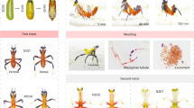 The coding sequence of the last exon of the wild-type GrMYB1 allele was amplified with Phusion HotStart II polymerase (Thermo Fisher Scientific, USA); PCR: 4 µl HF buffer (5×), 0.4 µl dNTPs (10 mM each), 2 µl GrMYB1-attB-F primer (5 µM, Supplementary Table 9), 2 µl GrMYB1-attB-R primer (5 µM, Supplementary Table 9), 0.2 µl polymerase, 1 µl cDNA, 10.4 µl ddH2O; PCR conditions: 98 °C for 30 s, 5 cycles of 98 °C for 10 s, 65 °C for 30 s, 72 °C for 40 s, 35 cycles of 98 °C for 10 s, 72 °C for 40 s, followed by 72 °C for 5 min. PCR reactions were cleaned up with a NucleoSpin® Extract II Kit (Macherey-Nagel, Germany) according to the manufacturer’s protocol. The amplicons were cloned into a pDONR207 vector via GATEWAY™ cloning (Thermo Fisher Scientific, USA): 75 ng of cleaned PCR fragment was combined with 75 ng pDONR207 and 1 µl BP clonase II, and ddH2O was added to a total of 5 µl. Reactions were incubated at 25 °C for 2 h, 0.5 µl proteinase K (2 µg µl−1) was added, and reactions were incubated at 37 °C for 10 min. Chemo-competent Escherichia coli DH5α (Thermo Fisher Scientific, USA) were transformed with this construct using a standard protocol, and plasmids were extracted with a QIAprep® Spin Miniprep Kit (Qiagen, Netherlands) according to the manufacturer’s protocol. In a second step, the GrMYB1 fragment was cloned into a pL4440 vector, a gift of Andrew Fire (plasmid #1654, Addgene, USA). To do so, 50 ng of pDONR207 construct were combined with 75 ng pL4440, 1 µl LR clonase II and ddH2O was added to 5 µl. The reaction was incubated as described above, and chemo-competent E. coli HT115 (courtesy of Anita Dirks) were transformed with this construct using a standard protocol. Double-strand RNA (dsRNA) was produced according to Lau et al.78 with some modifications: after overnight incubation at 37 °C/220 rpm in 5 ml lysogeny broth medium with 50 µg ml−1 ampicillin and 10 µg ml−1 tetracycline, the culture was diluted 1:100 in 500 ml 2× yeast tryptone medium with the same concentration of antibiotics, and incubated at 37 °C/220 rpm. At OD600 = 0.7, 2 ml of 0.1 M isopropyl-β-d-thiogalactopyranoside was added to a final dilution of 0.4 mM, and the culture was incubated for another 2 h at 37 °C/220 rpm. After centrifugation for 10 min at 3200 × g, the supernatant was removed, and the pellet was resuspended in 10 ml of 0.1 M phosphate buffer (pH 7.2; 720 µl of 1 M Na2HPO4, 280 µl of 1 M NaH2PO4, 9 ml H2O). Cells were disrupted in a Potter–Elvehjem homogenisator, and by freeze thawing the suspension five times with liquid nitrogen. After centrifugation for 20 min at 3200 × g, the supernatant was collected, filtered through Miracloth (Merck, Germany) and stored at −80 °C for use in the RNAi experiment.