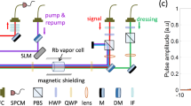 To achieve the fidelity performance of the current Raman quantum memory, we measure the fidelity using the equation \(F = \left| {Tr\left( {\sqrt {\sqrt {\rho _{{\mathrm{in}}}} \rho _{{\mathrm{out}}}\sqrt {\rho _{{\mathrm{in}}}} } } \right)} \right|^2\)35, where ρin and ρout are the reconstructed density matrices of Ein and ER, respectively. We record the quadrature amplitudes of the Ein and ER signals using homodyne measurement, and we then reconstruct the density matrices by tomographic reconstruction36. The setup used for homodyne detection is shown in Fig. 1b. To stabilize the phase difference between the Ein and ER pulses and simplify the homodyne setup, the write and read pulses are generated by the same laser and are controlled using one intensity modulator. In the measurement, the two weak signals, Ein and ER, are both short pulses. Matching the temporal modes of short pulses is difficult. Therefore, we use a strong continuous laser beam with the same frequency as the signal pulses Ein and ER as the local oscillator for homodyne detection (the detailed strategy can be found in refs. 36,37). We recorded 105 sets of quadrature amplitudes of the Ein and ER pulses while varying the phase of the local oscillator between 0 and 2π by scanning the piezoelectric transducer, multiplying the quadrature amplitudes of each pulse by the temporal shapes of the corresponding signals, and finally, integrating the product over the signal pulse duration. The temporal shape functions of the Ein and ER pulses are obtained by pointwise variance method. The integrated quadrature amplitude, which is normalized with the vacuum, as a function of the local oscillator phase is shown in Fig. 3a, where the mean number of photons contained in the Ein pulse is 7.9. The phase of the retrieved ER signal pulse closely follows that of the input Ein pulse. Insets in Fig. 3a are the probability distributions of amplitude quadratures of the Ein and ER pulses showing good Gaussian distributions.
