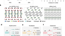 Nonetheless, the origin of the Rashba splitting in these lead halide perovskites remains vague. This is especially for CsPbBr3, which possesses centrosymmetry at any temperature, where the Rashba splitting effect is not expected. To reveal the underlying mechanisms, the energy difference between Peak 1 and Peak 2 in the PL profiles is used as a gauge to evaluate the Rashba band-splitting effect. Figure 4a displays the temperature-dependent energy difference, in which the splitting of all the perovskite SCs remains constant at low temperature but starts to increase monotonically when the temperature is larger than around 60 K. The temperature dependence of the splitting effect follows a dependence on the phonon occupation, which is empirically expressed as: \(\Delta E = \Delta E_0 + A/(\exp (E_{{\mathrm{ph}}}/k_{\mathrm{B}}T) - 1)\), where ΔE0 is the temperature-independent term, \(A/(\exp (E_{{\mathrm{ph}}}/k_{\mathrm{B}}T) - 1)\) is the temperature-dependent term. Eph is the energy of the phonon leading to the splitting effect, kB is the Boltzmann constant, and A is the scaling factor. The fitting results are listed in Table 1. ΔE0 has a value of 20–40 meV in all of perovskite SCs studied leading to distinct dual emission peaks at low temperatures (Supplementary Figure 8) and is highly dependent on sample conditions. The temperature-independent term should arise from static centrosymmetry breaking by the non-spherical A-site organic cations (MA, FA), surface distortion or internal interface distortions (such as twinning of orthorhombic phase, inclusion of different phases)32,34,45. MAPbBr3 generally possesses a higher static distortion compared to the other two by around 10 meV, which should be due to the centrosymmetry breaking by MA cations. Furthermore, it is interesting to note that without thermal distortion at low temperature, CsPbBr3 SC exhibits a static splitting of around 26 meV, implying the contribution of surface/interface distortions is significant in causing Rashba splitting at low temperature. The fitted values of Eph are 12 to 18 meV, which corresponds well with the broadening of the PL peaks (Supplementary Figure 9), and is attributed to the Pb–Br longitudinal optical (LO) phonon modes (Pb–Br–Pb bending and Pb–Br stretchings)25,47. Hence, it is inferred that the temperature-dependent splitting is strongly related to the thermal-induced perovskite octahedra cage deformation. Since the Rashba effect can only occur when local centrosymmetry is broken and an electric field is present, which means, the thermal fluctuation of the octahedra cage at elevated temperatures must have a strong polar motif that yields intense local fields around the Pb atoms32,35,48.