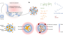 The design of the ingestible hydrogel device is schematically illustrated in Fig. 1. The hydrogel device consists of superabsorbent hydrogel particles (polyacrylic acid, ~450 μm in diameter) encapsulated in an anti-fatigue porous hydrogel membrane (freeze–thawed polyvinyl alcohol, ~750 μm in thickness, ~200 μm in pore diameter) (see Supplementary Figure 1 for biocompatibility data, Supplementary Figure 2 and Methods for fabrication details). This design decouples the swelling ratio, swelling speed, and mechanical robustness of hydrogels. Note that the swelling ratio is defined as Vmax/V0, and the swelling speed is quantified by the rate constant k in the equation \(\partial V/\partial t = k(V_{\max } - V)\), where V0 is the initial volume of the hydrogel device, Vmax is the fully swollen volume, and V is the volume at swelling time t24. The individual superabsorbent particles can swell ~160 times in volume within 5–10 min (Supplementary Figure 3). As the particles swell, water infiltrates through the pores on the membrane into the hydrogel device, mimicking the rapid imbibition of water by pufferfish. This fast swelling is further facilitated by the capillary effect between particles, which promotes water migration inside the hydrogel device (see Supplementary Note 1 for detailed analysis of swelling). The designed hydrogel membrane of the device is capable of sustaining at least 9000 cycles of 4.3 MPa tensile stress, and thus maintains its robustness under repeated loads, mimicking the anti-fatigue skin of the pufferfish23. To enable versatile functionalities such as biosignal recording and extended drug release, wireless sensors and drug depots can be incorporated inside the hydrogel device (Supplementary Figure 4). For safe and on-demand exit of the swollen hydrogel device from the gastrointestinal (GI) tract, a calcium chloride solution that flows into the hydrogel device and deswells the superabsorbent particles can be adopted to induce rapid shrinkage of the swollen hydrogel device (Fig. 1e, f). The calcium concentration is within the safe consumption level25.