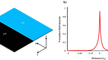Note that according to the helicity winding diagram (Fig. 3a), both TE and TM surface waves exist at every point of the two-mode zone (εr < 0, μr < 0), but only one of these modes is shown in Fig. 3b. Showing both of these modes results in the two diagrams in Fig. 3c, but only the first diagram corresponds to the propagating surface modes. Indeed, direct calculations show that the wavevectors of the surface modes have the form \(k_{{\mathrm{surf}}} \propto \sqrt {v_1v_2}\) and \(k_{{\mathrm{surf}}} \propto \sqrt { - v_1v_2}\) for the TM and TE polarizations, respectively (see Supplementary Note 3). Hence one of these is always real (propagating modes in the first diagram Fig. 3(c)) while the other one is imaginary (evanescent surface modes in the second diagram (Fig. 3c)). Although these evanescent surface modes have never been considered before, these are observable, e.g., in the near-field scattering of surface electromagnetic waves. Furthermore, \(k_{{\mathrm{surf}}} \to 0\) for both propagating and evanescent surface modes at interfaces involving epsilon-near-zero or mu-near-zero materials, where the contribution of evanescent surface modes can become crucial.