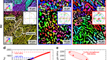 The EBSD and SEM observations were conducted by the CamScan Apollo 300 SEM equipped with a HKL–Technology EBSD system. The TEM analyses were operated on JEM–2100 F at 200 kV. The samples for EBSD and TEM were prepared, using a mixture of the 90% ethanol and 10% perchloric acid (vol.%). All tensile specimens were dog-bone-shaped, with a gauge length of 15 mm, a width of 3.2 mm, and a thickness of 600 μm. In terms of the ultrafine-grained material, here, such tensile dimensions are typically consistent with that frequently reported in the literature16,18. Meanwhile, there are over 400 grains along the thickness direction in specimens (Fig. 1 and Supplementary Fig. 1a, b), which far exceeds the grain number (~100) required theoretically to ensure the representativeness and reproducibility of tensile data at a larger scale. Moreover, to obtain the reproducible tensile property, all tensile tests were repeated five times. The direction of tensile tests was parallel to the rolling direction. Tensile tests were carried out at room temperature using an MTS Criterion Model 44 with an initial strain rate of 2.5 × 10−4 s−1. The condition for LUR tests was the same as that of the monotonic tensile test. Upon straining to a designated strain at the strain rate of 2.5 × 10−4 s−1, the specimen was unloaded by the stress-control mode to 20 N at the unloading rate of 200 N min−1, followed by reloading at a strain rate of 2.5 × 10−4 s−1 to the same applied stress before the next unloading. All tensile tests were conducted, using a 12-mm extensometer to monitor the strain.
