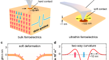 The strain distribution in a 3.5 nm-thick STO thin film pressed with an AFM tip is obtained by solving the elastic equilibrium equation by using Khachaturyan microelasticity theory37 and the Stroh formalism of anisotropic elasticity38. The detailed procedure has been elaborated in previous works39. Here, we discretized three-dimensional space into 64 × 64 × 700 grid points and applied periodic boundary conditions along the x1 and x2 axes. The grid spacing was ∆x1 = ∆x2 = 1 nm and ∆x3 = 0.1 nm. Along the x3 direction, 35 layers were used to mimic the film; the relaxation depth of the substrate featured 640 layers to ensure that the displacement at the bottom of substrate was negligibly small. To estimate surface stress distribution that developed on AFM-tip pressing, we adopted the Hertz contact mechanics of the spherical indenter40 with a tip radius of 30 nm and a mechanical force of 1–7 μN. The Young’s moduli and Poisson ratios of the Pt tip and the STO film were Etip = 168 GPa and υtip = 0.38, and Efilm = 264 GPa and υfilm = 0.24, adapted from ref. 41. The electrostrictive and rotostrictive coupling coefficients of STO were adapted from ref. 42. See Supplementary Note 2 for more details.