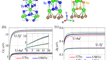 The combination of density functional theory (DFT) and dynamical mean-field theory (DMFT)37, as implemented in the full-potential linearized augmented plane-wave method38,39, was used to describe the competition between the localized and itinerant nature of 5f-electron systems. The correlated uranium 5f electrons were treated dynamically by the DMFT local self-energy, while all other delocalized spd electrons were treated on the DFT level. The vertex corrected one-crossing approximation38 was adopted as the impurity solver, in which full atomic interaction matrix was taken into account. The Coulomb interaction U = 4.0 eV and the Hund’s coupling J = 0.57 eV were used for the DFT + DMFT calculations.
