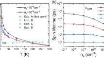 The electron and hole spin dephasing times are almost constant at temperatures less than 15 K. At higher temperatures the electron spin precession is not detectable due to the abrupt shortening of \(T_{2,{\mathrm{e}}}^ \ast\). Hole spin dynamics can be measured up to 100 K and \(T_{2,{\mathrm{h}}}^ \ast\) smoothly decreases with increasing temperature (Fig. 2e). This behavior can be described by an activation-type dependence: \(1{\mathrm{/}}T_2^ \ast (T) = 1{\mathrm{/}}T_2^ \ast (0) + w\,{\mathrm{exp}}( - {\mathrm{\Delta }}E{\mathrm{/}}k_{\mathrm{B}}T)\). Here, \(T_2^ \ast (0)\) is the spin dephasing time at zero temperature, w is a phenomenological prefactor, and kB is the Boltzmann constant. The activation energy ΔE = 14 meV and w = 160 ns−1 are evaluated from the fit. This behavior can be related to either hole delocalization or to a spin-flip process mediated by LO phonons, whose energy in CsPbBr3 is about 18 meV19.