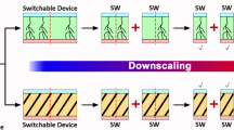 In accordance with the consecutive oxidation characteristics of PFTPA-Fc in solid thin film forms, the ITO/PFTPA-Fc/Pt devices show interesting memristive switching behaviors in either the high resistance state (HRS) or low resistance state (LRS). HRS currents monitored between ±2 V show four distinguishable stages that are useful for the realization of multilevel memory (Fig. 4). LRS currents exhibit consecutive modulation and can be utilized in information processing applications (Fig. 5). The low-voltage memristive behavior in HRS and LRS are independent yet inter-convertible, wherein an abrupt bistable resistive switching operation at high-voltage level (± 4 V) can reconfigure the device from one mode to another (Supplementary Figure 13). Referring to the oxidation behavior of PFTPA-Fc as shown in Figs. 2 and 3, the underlying mechanism of its unique device characteristics can be understood as following. The HOMO/LUMO energy levels and electrode work functions alignment suggests that hole injection from ITO into the PFTPA-Fc layer in the negatively-biased voltage sweep is a favored process34,36,47,48,49,50. When the electric field is low, charge carriers do not possess sufficient energy to overcome the Schottky barrier at the ITO/PFTPA-Fc interface, and the small current as observed is likely due to tunneling of the charge carriers. When the applied voltage exceeds the Schottky barrier height of ~0.23 eV, holes are injected into the polymer and can migrate through the continuous positive ESP channel of the polymer backbone (in light blue color of Fig. 3a). When the applied voltage reaches the oxidation potential of the ferrocene moiety in the low-voltage range of 0 to ± 2 V, the pendant Fc unities become oxidized and give rise to the four-stage switching in HRS of the polymer. Ramping of the applied voltage to −4 V can initiate the subsequent fast oxidation of the triphenylamine chromophore, giving rise to the abrupt current jump observed at −3.3 V and programming the device from HRS to LRS (Supplementary Figure 13). In LRS the redox behavior of the TPA groups is ceased when being scanned between ± 2 V, and the continuous modulation of device current is ascribed to the Fc redox behavior again (Fig. 5a). PFF6-Fc with only Fc pendants also exhibits multilevel switching behavior (Supplementary Figure 14a), while abrupt bistable resistive switching characteristics are observed in PFTPA that contains only TPA chromophores (Supplementary Figure 14b). In comparison, PFF6 with none of the redox active groups shows insulating nature (Supplementary Figure 14c). The current–voltage curves of these control samples again confirms that the low-voltage level consecutive switching and high-voltage level bistable switching behaviors of PFTPA-Fc are attributed to the oxidation of ferrocene and triphenylamine groups, respectively. Being different from those documented in the literature using bistable switching behavior of ferrocene containing materials for binary data storage applications27,33,34,51,52,53,54,55,56, the continuous modulation of the material’s conductance in a single voltage polarity may make the integration of multilevel memory (with enhanced storage density) and computing capability into a single memristor based processing-memory unit possible through redox induced memristive switching in a natural accumulation manner.