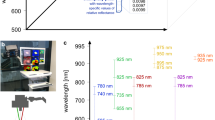 where S(x, y, λ) is absorbance at the image point of x, y and at the wavelength of λ. Soxy(λ) and Sdeoxy(λ) are absorbance of oxygenated and deoxygenated blood at the wavelength of λ. Coefficients α and β are calculated by solving this equation with non-negative least squares algorithm. Then, sO2 is calculated by following equations: α/(α + β)63,64. We used calculated average absorbance of blood samples (i) and (iv) as reference absorbance of oxygenated and deoxygenated blood, respectively.