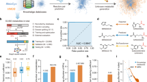 We retrieved all RPs from the KEGG database (9603 RPs and 7639 metabolites) and further constructed a metabolic reaction network (MRN, Fig. 1a). In the MRN, one node represents one metabolite and two metabolites connected by an edge represent the reaction-paired neighbor metabolites. To test whether structurally similar metabolites in a reaction pair have a high chance to share similar MS2 spectra, we used three spectral databases of metabolites: our in-house library22, NIST17 [https://chemdata.nist.gov/], and METLIN. While neighbor metabolites in RPs were retrieved, the same number of metabolites from non-RPs was also generated as controls. Then we compared four scoring methods (dot product (DP)23, bonanza24, hybrid similarity search (HSS)25, and GNPS26) and finally chosen DP to compare MS2 spectral similarity between metabolites in RPs and non-RPs (Supplementary Note 1 and Methods). In our in-house library, more than 55.3% of reaction-paired neighbor metabolites have a DP score larger than 0.5. In contrast, only 5.2% of non-neighbor metabolites have a DP score larger than 0.5 (Fig. 1b). Consistently, the other two independent databases showed similar results (Fig. 1b). To demonstrate how the cosine similarities decay as a function of the reaction distance between two metabolites, we constructed RPs and non-RPs with two, three, four, and five steps, respectively. As shown in Supplementary Fig. 1, the percentages of RPs with DP > 0.5 significantly decreased to 26.5%, 15.5%, 10.3%, and 8.0% from 55.3% (with 1 step) for two, three, four, and five reaction steps, respectively. Combined, our data demonstrated that reaction-paired neighbor metabolites tend to share similar MS2 spectra compared to non-RP metabolites.