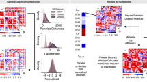 We imaged all the samples using a ×100 1.45 NA objective mounted on a custom-built Eclipse Ti-E inverted microscope system (Nikon) controlled by the NIS Elements software (Nikon) and equipped with an iXON Ultra 888 ECCD camera (Andor Technology). We acquired multiple image stacks per sample, each consisting of 49–60 focal planes spaced 0.3 μm apart. We converted raw images from ND2 (Nikon) or CZI (Carl Zeiss) format to uncompressed TIFF format using the nd2_to_tiff and czi_to_tiff scripts, respectively, from the our custom-developed pygpseq Python3 package available on GitHub: https://github.com/ggirelli/pygpseq/. We removed out-of-focus images by using the tiff_findoof v0.3.1 tool from the pygpseq package. The script identifies and discards stacks in which the peak of the gradient magnitude of the stack intensity over Z does not fall in a range of 50% of the stack around the mid slice. To correct for chromatic aberrations and shifts between channels, we imaged TetraSpeck Microspheres (0.1 µm, fluorescent blue/green/orange and dark red, Thermo Fisher Scientific, cat. no. T7279) before or after each imaging session. We used the DNA stain channel as the reference channel, and determined the location of the beads by fitting a 2D Gaussian profile in (x,y) and a 1D Gaussian in z by optimizing a maximum-likelihood functional using the Nelder–Mead method41. Signals corresponding to the same bead were identified by clustering the strongest dots detected in the DNA channel with the strongest dots in each other channel. After determining the shift between the channels, we detected outliers and discarded them. Finally, we fitted a second order 2D polynomial deformation to the (x,y) plane, by using the remaining point pairs. Along the z directions, we only corrected for shifts42. After chromatic aberration correction, we performed automated 3D segmentation of cell nuclei stained with Hoechst 33342. To this end, we first deconvolved the DNA staining channel using the Huygens Professional v17.04 Software (Scientific Volume Imaging), with the following parameters: CMLE algorithm, null background, and signal-to-noise ratio (SNR) of 7, in 50 iterations. We estimated a theoretical point spread function using the same software, considering both our microscope setup and the optical configuration used to acquire the images. After deconvolution, we performed 3D segmentation of the nuclei in each field of view, using the tiff_auto3dseg script of the pygpseq package. The script combines with a logical AND operation two binary masks, generated with the threshold_otsu and threshold_local methods from the scikit-image.filters package43. Then, it discards objects touching the XY contour of the image, fills any holes in the masks, and performs a dilate-fill-erode operation. To identify putative G1-phase cells, we adapted a previously published approach44 that selects nuclei based on the integral of DAPI intensity over the nuclear volume. Briefly, the algorithm first tries to fit a sum of Gaussians to both distributions of the integral of DNA staining intensity over the nuclear volume, and of the nuclear area in the z-projection of the segmented images. If the fitting fails, the algorithm fits a single Gaussian instead. Lastly, we labeled as G1 the nuclei falling in a range of ±3 standard deviations around the mean of the major fitted Gaussian in both distributions.