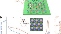 Figure 1a displays the simulation box where one hydroxide with no counterion is inserted into a water/graphene interface (water/h-BN interface not shown) equivalent to an anion concentration of 0.57 M. We propose an original PMF protocol as compared to others16,23 schematized in Fig. 1b that we summarize hereafter. The procedure is detailed in the Methods section and in Supplementary Methods. The anion-surface distance \(D_{{\mathrm{O}}^ \ast - {\mathrm{A}}^ \ast }\) is fixed by a constraint and is progressively varied by fixed values starting from the surface until the hydroxide has reached the bulk. The hydrogen coordination of the anion oxygen \(n_{{\mathrm{O}}^ \ast - {\mathrm{H}}}\) is determined using a switch function (see Supplementary Fig. 1) and is restrained around a target value n* by applying a harmonic potential. Because of the hydroxide solvation varying between the surface and bulk water, its mean coordination takes up values respectively corresponding to 1.0 and 1.3 (see Supplementary Figs. 2 and 3). Two sets of MD trajectories were therefore computed with n* = 1.0 and n* = 1.3, respectively represented by blue and green plots in Fig. 1b. In order to obtain the effective coordination per distance to the surface and accordingly deduce the free energy profile, we apply for each surface-anion distance a standard debiasing method based on the weighted histograms analysis method (WHAM)24,25 to the two sets of constrained MD runs. This yields an intertwined set of trajectories labelled WHAM (black lines in Fig. 1b) along which thermodynamic integration is performed to obtain the free energy profile.