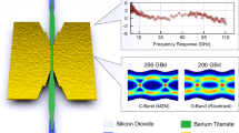 The plasmonic IQ modulators were fabricated in-house on a silicon-on-insulator (SOI) wafer consisting of a 220-nm-thick silicon device layer and a 3-μm-thick buried oxide. Electron-beam lithography using a Vistec EBPG5200 system was applied to pattern the structures in all process steps. A negative tone electron-beam resist was used to pattern photonic components comprising waveguides, MMIs and fiber-to-chip grating couplers (GCs)69. The patterns were transferred into the silicon device layer (fully etched structures) by applying an inductively coupled plasma—reactive ion etching (ICP-RIE). Partial etching (70 nm deep) of blazed GCs was realized with the use of a positive tone electron-beam resist and the ICP-RIE process as in the case of the fully etched silicon structures. A 700-nm-thick SiO2 cladding layer was deposited by plasma-enhanced chemical vapor deposition (PECVD) and locally opened in the active plasmonic sections using reactive ion etching (RIE). The SiO2 cladding reduces the influence of the OEO cladding on the GC performance. Plasmonic MIM waveguides and electrodes as well as the heater structure were produced with a lift-off process applied to a 150-nm-thick e-beam evaporated layer of gold. The organic electro-optic (OEO) material composite 75% wt HD-BB-OH/25% wt YLD12459 was deposited in a post-processing step by spin coating. Subsequently, a poling process induced the nonlinearity38. Envisioning co-integration with other devices, the OEO cladding material may be locally removed by an additional lithography step followed by structuring, e.g., by an O2 plasma-etching process.