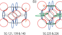 A tight-binding model based on a face-centered-cubic (fcc) lattice is provided to illustrate the nodal rings and flat drumhead surface states. The lattice can be considered an array of dimer chains; each chain is an analogy of a typical Su–Schrieffer–Heeger (SSH) model. The hopping amplitude along the z direction is \(- t \pm \delta t\) (t > 0 and δt > 0), which is represented by the smaller/larger yellow rod in Fig. 1a. The Hamiltonian of this model in momentum space is characterized by \(H = d_x\sigma _x + d_y\sigma _y\), where \(d_x = - 2{\mathrm{cos}}k_x - 2{\mathrm{cos}}k_y - 2t{\mathrm{cos}}k_z\), \(d_y = - 2\delta t{\mathrm{sin}}k_z\) and σx,y are Pauli matrices that represent sublattice pseudospins. The nearest-neighbor hoppings (green rods) between distinct sublattices in the x–y plane are set to −1, and all distances between sublattices are set to unity. The eigenvalues of the Hamiltonian \(E_ \pm = \sqrt {d_x^2 + d_y^2}\). When dx = dy = 0, band crossings occur and the crossing points form nodal rings in the extended Brillouin zone (BZ), as shown in Fig. 1b. The nodal ring that lies on the kz = 0 (or π) plane obeys the contour \({\mathrm{cos}}k_x + {\mathrm{cos}}k_y = \mp t\). From a symmetry consideration, the existence of nodal rings is protected by the mirror symmetry on the kz = 0 (or π) plane. The ring states possess opposite eigenvalues with respect to the mirror operation and avoid band repulsion21, which contributes to the linear crossings for the band dispersion, as shown in Fig. 1c. By considering kx and ky as parameters, the Zak phase of the model along the kz direction is obtained as \({\mathrm{\gamma }} = ({\mathrm{\pi }}/2)\left[ {1 + {\mathrm{sgn}}\left( {t - \left| {{\mathrm{cos}}k_x + {\mathrm{cos}}k_y} \right|} \right)} \right]\). The Zak phase is π within the area (red region in upper panel of Fig. 1d) between the projections of the nodal rings on the kx − ky plane, which causes the existence of topological surface states. In the lower panel of Fig. 1d, flat drumhead surface dispersions are obtained in the π Zak phase region with rigid boundaries in the z direction. No topological surface states are observed in the x (or y) direction for the trivial Zak phase along the kx (or ky) direction. The drumhead surface dispersions projecting to an arbitrary direction are discussed in Supplementary Note 1.