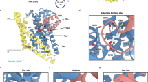 Comparison of the apo and holo structures showed that 2-AIB binding causes a 2 Å displacement of residue Gly 19, located within the unwound segment of TM1 (Fig. 3c). This substrate-induced shift brings the O atom of Gly 19 at H-bond distance from the hydroxyl group of Ser 282 (TM8) (Fig. 3c). In agreement, MD of the holo structure showed that dissociation of the substrate is accompanied by a concomitant relaxation of the TM1 unwound segment that separates Gly 19 and Ser 282, and reduces the distance between Gly 19 and Asp 202 (Supplementary Fig. 7a–e), thereby supporting the notion of a substrate-induced fit. Ser 282 is fully conserved among human LATs3 (Supplementary Fig. 8), although mutation to alanine in both BasC (S282A) and human Asc-1 (hAsc-1) (S325A) did not abolish 10 µM [3H]l-alanine uptake (Fig. 3d). These results indicate that the interaction of TM1 (Gly 19) and TM8 (Ser 282) induced by substrate binding is not a requisite for transport function. In agreement, MD showed that the Gly 19–Ser 282 H-bond is not stable, due to rotamer oscillation of Ser 282 while 2-AIB is in the binding site (Supplementary Fig. 7e).