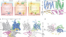 The buried surface resulting from dimerization in the SLC26Dg membrane domain amounts to ~ 350 Å2, which is small, not only in comparison with the SLC4 and SLC23 family whose membrane interfaces measure ~ 1000 Å2 and ~ 2000 Å2 44, respectively, but also in relation to other oligomeric membrane proteins36. It is likely that additional extrinsic factors contribute to extend and stabilize the SLC26 membrane dimer interface, e.g., interfacial lipids that were recently reported to stabilize an SLC23 dimer45 and other oligomeric membrane proteins36. In this respect, the STAS domain appears to be relevant as well. The short linker region connecting TM14 and the STAS domain implies its close proximity to the membrane dimer interface. In addition, the STAS domain affects TM13 and TM14 at the center of the dimer interface (Supplementary Fig. 8). Given that isolated SLC26–STAS domains do not appear to form dimers13,46,47, we expect the STAS-mediated effect on the gate domain to result from a direct interaction between the STAS domain and the membrane domain. This interaction may also form the basis for the enhanced transport rates observed in the presence of the STAS domain4,10,14.