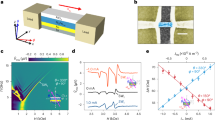 The magnetodynamic characteristics of the permalloy layers are determined by performing FMR measurements on unprocessed thin films using a NanOsc Instrument PhaseFMR system. Broadband FMR measurements were carried out with an in-plane field (H) and a coplanar waveguide where the FMR response is measured over the frequencies (f) range of 2–16 GHz. At each frequency, the resonance field (Hr) and the FMR linewidth (ΔH) are extracted by fitting the FMR to a Lorentzian function. We determined the effective magnetization (μ0Meff) of thin films by fitting the dispersion relation to the Kittel equation. The Gilbert damping (α) is extracted by following the change of the FMR linewidth ΔH vs the frequency and using the relation \(\Delta H = \frac{{2\alpha }}{\gamma }(2\pi f) + \Delta H_{\mathrm{0}}\), where ΔH0 is the inhomogeneous broadening. The results of α as a function of the film thickness are shown in (Fig. 1b). Note that ΔH0 is measured to be less than 0.2 mT in these films.
