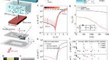Over the course of several hours, our devices exhibit excellent stability, and even during a full temperature cycle from 300 to 160 K, degradation was minimal (Supplementary Note 2, Supplementary Fig. 2; over longer periods (weeks) the beneficial effect of the solvent additive (DCB) is, however, gradually lost as the solvent evaporates from the films). This excellent stability is reflected when monitoring the power m of the current density dependence on voltage (extracted through \(m = \frac{{\partial \;{\mathrm{ln}}(I)}}{{\partial \;{\mathrm{ln}}(V)}}\)) over repeated measurements (Fig. 1e, Supplementary Fig. 3a). Our diodes indeed exhibit robustly an ideal textbook-like SCLC behavior, transitioning from a resistive regime (m = 1), through a steep trap-filling regime (m » 2) to an extended trap-free SCLC regime following the Mott–Gurney Law (m=2).