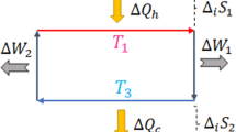 where Δβ = βB − βA ≥ 0 and \(S\left( {\rho _i^\tau \parallel \rho _i} \right) = {\mathrm{Tr}}_i\,\rho _i^\tau \left( {{\mathrm{ln}}\,\rho _i^\tau - {\mathrm{ln}}\,\rho _i} \right) \ge 0\) denotes the relative entropy23 between the evolved \(\rho _{{\mathrm{A(B)}}}^\tau = {\mathrm{Tr}}_{{\mathrm{B(A)}}}{\cal{U}}_\tau \rho _{{\mathrm{AB}}}^0{\cal{U}}_\tau ^\dagger\) and the initial \(\rho _{{\mathrm{A(B)}}}^0\) reduced states. The latter quantifies the entropic distance between the state at time τ and the initial thermal state. It can be interpreted as the entropy production associated with the irreversible heat transfer, or to the entropy produced during the ensuing relaxation to the initial thermal state32,33. According to Eq. (5), the direction of the energy current is therefore reversed whenever the decrease of mutual information compensates the entropy production. The fact that initial correlations may be used to decrease entropy has first been emphasized by Lloyd34 and further investigated in refs. 35,36. Heat flow reversal has recently been interpreted as a refrigeration process driven by the work potential stored in the correlations12. In that context, Eq. (5) can be seen as a generalized Clausius inequality due to the positivity of the relative entropies. The coefficient of performance of such a refrigeration is then at most that of Carnot12.