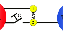 with the variation in the von Neumann entropy, given by \({\mathrm{\Delta }}S_i = S\left( {\rho _i^\tau } \right) - S\left( {\rho _i^0} \right)\) and the internal energy change of the i-th subsystem defined as \({\mathrm{\Delta }}E_i = {\mathrm{Tr}}_i{\kern 1pt} \rho _i^\tau {\cal{H}}_i - {\mathrm{Tr}}_i{\kern 1pt} \rho _i^0{\cal{H}}_i\). Energy conservation for the combined isolated system (AB) further implies that ΔEA = −ΔEB = QB, for constant interaction energy. As a result, we obtain,