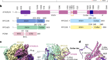 After chromosomal duplication, PCNA needs to be released from the chromatin to prevent inappropriate recruitment of replication enzymes3,16,17. RFC-like complexes (RLCs) are suggested to regulate chromatin-association of DNA clamps. RLCs share four small subunits—RFC2, 3, 4, and 5—with RFC. The largest subunit of RFC, RFC1, is replaced by different proteins in RLCs. Mammalian cells have three RLCs: ATAD5-RLC, CTF18-RLC, and RAD17-RLC. However, it has been controversial which complex is responsible for the release of DNA-loaded PCNA. Previously, it was reported that human RFC could unload PCNA18,19,20,21. Another report argued that yeast Ctf18-RLC might have PCNA unloading activity22,23. However, those in vitro experiments have not been supported by cell-based experiments. RAD17-RLC loads DNA-damage clamps24. PCNA unloading could be mediated by ATAD5-RLC in human cells3. Depletion of human ATAD5 led to PCNA accumulation on chromatin. In budding yeast, deletion of elg1, a homolog of ATAD5, also resulted in an increase of chromatin-bound PCNA17,25,26. Replication proteins that interact with PCNA abnormally accumulated on the chromatin in ATAD5-depleted human cells, showing the importance of PCNA unloading3. Furthermore, elg1 or ATAD5 depletion caused genomic instability27,28. These results imply the functional importance of ATAD5-RLC, but it has not been proven whether ATAD5-RLC is a biochemically defined PCNA unloader. Furthermore, there have been no studies on the mechanism of PCNA unloading, which, due to the irreversible step of ATP hydrolysis, cannot simply be the reversal of the PCNA loading reaction.