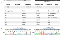 To confirm whether base editing for multiple sites can be achieved by BE3 in the genome of porcine embryos (Fig. 1a), we selected six porcine genes, namely, DMD, TYR, LMNA, RAG1, RAG2, and IL2RG, which encode dystrophin, tyrosinase, lamin A/C, RAG1 protein, RAG2 protein, and IL-2 receptor gamma chain, respectively, as the target sites (Fig. 1b). Premature stop codons (Q493STOP and Q28STOP) would be generated by a single C-to-T conversion at the target sites in DMD and TYR, which are expected to result in Duchenne muscular dystrophy (DMD) and albinism, respectively. For LMNA, C-to-T conversion (a synonymous mutation, G608G) at the target site would create a cryptic splice donor site that produces a truncated splicing mutant of lamin A/C protein, termed “progerin”, resulting in Hutchinson-Gilford Progeria Syndrome (HGPS)25. For RAG1, RAG2, and IL2RG, premature stop codons are expected to be generated due to C-to-T conversion. Mutations in RAG1 or RAG2 would result in the complete absence of B and T cells26, and IL2RG mutations lead to the absence or profound depletion of T and natural killer (NK) cells without affecting the number of B cells27. RAG1-, RAG2-, and IL2RG-deficient pigs would lack B cells, T cells, and NK cells (B/T/NK cells). In vitro transcribed DTL (DMD-sgRNA, TYR-sgRNA, and LMNA-sgRNA) or R12I (RAG1-sgRNA, RAG2-sgRNA, and IL2RG-sgRNA) with BE3 mRNAs (150 ng/μL) were co-injected together into 100 porcine parthenogenetically activated (PA) oocytes, which were conveniently available by in vitro matured oocytes derived from the ovary of slaughtered pigs. The injected PA embryos were cultured for 6 days post-parthenogenetic activation until blastocyst formation. The blastocyst rate of embryos injected with BE3 mRNA and DTL or R12I was 24% (24/100) and 25% (25/100) (Fig. 1e), respectively, which is consistent with the blastocyst rate of the embryos injected with water (24%, 24/100), indicating that BE3 and sgRNAs did not affect the early development of porcine embryo. A single blastocyst was lysed individually for genotyping by Sanger sequencing. Targeted point mutations were observed in 18 out of 24 (75%) embryos for DTL and 14 out of 22 (63.6%) embryos for R12I at target sites. Of these screened blastocysts, 12 for DTL (50%, 12/24) and 8 for R12I (36.4%, 8/22) were identified to have C-to-T mutations in three genes (Fig. 1c–e; Supplementary Fig. 1), four for DTL (16.7%, 4/24), and five for R12I (22.7%, 5/22) showed double-gene base editing (one for DMD and TYR, three for DMD and LMNA, one for RAG1 and RAG2, two for RAG1 and IL2RG, and two for RAG2 and IL2RG), two for DTL (8.3%, 2/24) and one for R12I (4.5%, 1/22) showed single-gene base editing (one for TYR, one for LMNA, and one for IL2RG) (Fig. 1e). In addition to the specific conversion of C-to-T mutation, a few C-to-A substitutions were also found at expected positions of TYR-sgRNA (Fig. 1c; Supplementary Fig. 1a). In some embryos, C-to-T conversions occurred not only at positions 4–8 but also at position 13 for TYR-sgRNA, position 11 for LMNA-sgRNA, position 9 for RAG1-sgRNA, position 3 for RAG2-sgRNA, and positions 3, 9, and 10 for IL2RG-sgRNA, which would lead to the corresponding amino acid changes (S30L, S610F, S62F, S2L, V154V, L156L, and Q157STOP, respectively) (Fig. 1c, d; Supplementary Fig. 1a, b).