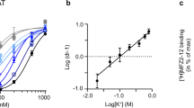 The activity of purified dDAT was assessed by scintillation proximity assay (SPA). 50 ng per well (7 nM) of protein was incubated with 1.25 mg ml−1 copper yttrium silicate (Cu-YSi) beads (PerkinElmer) in buffer A supplemented with 200 mM NaCl. Nisoxetine saturation binding was set up using 10% [3H]nisoxetine (79.8 Ci mmol−1; PerkinElmer). DA competition binding assays was performed with 30 nM [3H]nisoxetine and increasing concentration of unlabeled DA. Non-specific binding was determined in the presence of 100 µM unlabelled nortriptyline. SPA experiments were set up in triplicate wells of a 96-well white wall clear bottom plate. The samples were incubated for 30 min at room temperature. The samples were further incubated for 16 h incubation at 4 °C for nisoxetine saturation binding experiments. [3H]nisoxetine binding was monitored using a MicroBeta liquid scintillation plate counter (PerkinElmer) using a 1-min counting protocol. Data were analyzed by non-linear regression analysis and fitted to a one-site saturation or dose-response function, respectively, using GraphPad Prism 7 software (GraphPad, San Diego, CA).