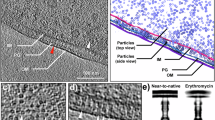 To enrich AcrAB–TolC pumps in situ, we overexpressed AcrA, AcrB, and TolC in BL21 (DE3) cells at a level at which the cells can still replicate and grow (Supplementary Fig. 1). Then we imaged cells with Cryo-ET under antibiotic treatment that promotes pump assembly20. Three-dimensional tomographic reconstructions revealed detailed structures of the Gram-negative bacterial envelope, with abundant channel-like densities spanning the cell envelope (Fig. 1 and Supplementary Movie 1). These densities are rarely observed in wild-type E. coli cells (Supplementary Fig. 2), implying that they correspond to AcrAB–TolC pumps. In addition, the distance between the outer membrane and the inner membrane stays constant at the sites where the AcrAB–TolC pumps occur, suggesting that the periplasm may be pinched by these assemblies.
