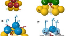 Figure 2c shows the distance-dependent strengths of Jiso, Janiso and D, whose components all display oscillations in the sign typical for RKKY interaction (see Fig. 2d). These sign oscillations, together with a rapid decrease in the strength of the RKKY interaction (Fig. 2c) and the relatively strong out-of-plane MAE of the fcc satellite atoms \({\cal{D}}_{\mathrm{a}} = - 0.19\,{\mathrm{meV}}\)25 and trimer \({\cal{D}}_{\mathrm{t}} = - 0.09\,{\mathrm{meV}}\)27 lead to an almost collinear spin orientation between trimer and satellite atom along the surface normal, which alternates between FM and AFM as their separation is varied. For complexes including hcp satellites, the experimental results (Supplementary Note 1) point towards a deviation of the atom’s spin orientation from the surface normal due to the in-plane MAE.