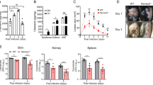 Mouse skin was shaved 3 days prior to experiments allowing potential micro wounds to heal and skin to recover from shaving. To analyze S. aureus skin colonization, 2 × 15 µL (right and left flank) containing 1.5 µg lugdunin, S. epidermidis CM, the combination of both, or PBS were epicutaneously applied for 24 h on the shaved back skin of C57BL/6 WT mice by using 8 mm filter paper discs and Finn Chambers (Smart Practice). The next day, Finn Chambers were removed and 2 × 15 µL of a bacterial suspension containing 1 × 108 S. aureus were epicutaneously applied using new filter paper discs and new Finn Chambers. After 24 h, mice were euthanized and 4 mm skin punches were used for S. aureus CFU analysis.