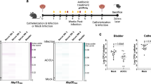 Six- to 8-wk-old female C57BL/6 mice were obtained from Charles River Laboratories. Mice were transurethrally implanted with a small piece of silicone tubing (catheter implant) and inoculated52. Briefly, mice were anesthetized by inhalation of 4% isoflurane, and a 4- to 5-mm piece of silicone tubing (catheter) was placed in the bladder via transurethral insertion. Bacterial strains were prepared for inoculation after static growth twice at 37 °C by centrifugation at 6500 rpm for 5 min, washing twice in 1 × PBS, and resuspension in PBS to the final inoculum. When indicated, mice were infected immediately following implant placement with ∼2 × 108 CFUs bacteria in 50 μL via transurethral inoculation. At 24 h post-infection (pi), mice were euthanized, and kidneys, bladders, and implants were aseptically removed. The bacterial load present in each tissue was determined by homogenizing each organ in PBS and plating serial dilutions on LB agar supplemented with antibiotics when appropriate. All CAUTI studies were performed in accordance with the guidelines of the Committee for Animal Studies at Washington University School of Medicine and we have complied with all relevant ethical regulations. Mice were housed with a cycle consisting of 12 h of light and dark with access to standard food and water ad libitum.