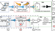 where H(M) is the von Neumann entropy of the remotely prepared state and H(M|C) = H(M, C) − H(C) is the conditional entropy of M given the feedforward signal (Supplementary Note 6). We experimentally investigate the quantum one-time pad by measuring the prepared states as a function of the JPA 3 parameters, while additionally detecting the signal C′ from the second directional coupler output. We compute δ = H(M) − H(M|C′) to verify Eq. (2) under the reasonable approximation C′ ≈ C (due to τ ≃ 1) using state tomography. In Fig. 4b, we observe a decrease in δ when moving towards the optimal point where the smallest value δ = 0.06 ± 0.04 is reached and the entropy of the prepared state is H(M) = 0.80 ± 0.02. The observation \(\delta \ll H(M)\) indicates that the remote preparation of a quantum state on Bob’s side is close to perfect security when approaching the optimal point. At the same time, there is a trade-off between the security and range of prepared states. As previously mentioned, a straightforward extension of the optimal working range of RSP can be realized by adding a phase shifter on Alice’s side. Then, all optimally prepared states would fulfill the security criterion H(M) = H(M|C) for arbitrary squeezing angles while the accessible squeezing level and purity stay unaffected. It is important to note that a potential eavesdropper cannot obtain any information about M by listening exclusively to the TMS resource state since the encoding of M happens later in the protocol. Furthermore, if the eavesdropper completely disentangles the TMS state by its actions, RSP yields no squeezing in the final state which could be exploited to detect the eavesdropper’s presence.