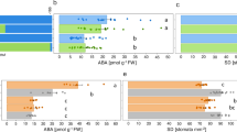 Leaf level physiology was measured in both wheat and Arabidopsis lines using a LI-6400XT portable IRGA coupled with 2 cm2 Li-6400-40 leaf chamber fluorometer (LI-COR, Lincoln, NE, USA). Spot measurements of stomatal conductance to water vapour (gs) and net assimilation rate (A400) were collected on four replicate wheat plants and six replicate Arabidopsis plants, and used to calculate instantaneous water use efficiency (iWUE) as A400/gs. For wheat lines, chamber conditions were controlled at 24 °C leaf temperature, a saturating light level of 1500 μmol m−2 s−1, reference CO2 concentration of 400 µL L−1, and approximately 60% RH. For Arabidopsis lines, chamber conditions were controlled at 21 °C leaf temperature, a saturating light level of 1200 μmol m−2 s−1, reference CO2 concentration of 400 µL L−1, and approximately 60% RH. Leaves were pre-acclimated to these chamber conditions until reaching steady state and full stomatal opening (i.e., ~20–30 min) before gs was logged for each plant. Measurements were collected on the youngest fully expanded leaf of 30-day-old wheat plants and the largest leaf of 35-day-old Arabidopsis plants. Mesophyll conductance to CO2 (gm) was calculated32 using the LandFlux fitting tool (version 10.0; http://landflux.org/Tools.php) using a series of assimilation data points collected across a range of CO2 concentrations under the same light and leaf temperature conditions described above.