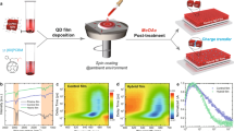 All of PV devices was fabricated by following previous literatures with slight modification10,11. Patterned indium-doped tin oxide (ITO) glass was cleaned by sonicating in isopropanol for 30 min and treated with UV-ozone for 5 min. An ~50 nm compact TiO2 layer was deposited by spin-coating a clear solution of TiO2 at 3000 rpm for 20 s ;and then annealing at 450 °C for 30 min. The TiO2 solution was synthesized by a sol-gel method from a precursor prepared by mixing 5 mL of EtOH, two drops of HCl, 125 mL of deionized water, and 375 mL of titanium ethoxide. The QD absorber layer was deposited following the procedure described above. Spiro-OMeTAD films were deposited by spin-coating at 5000 rpm for 30 s from a solution containing 72.3 mg spiro-OMeTAD, 28.8 μL 4-TBP and 17.5 μL of a bis(trifluoromethane)sulfonimide lithium salt (LiTFSI) stock solution (520 mg mL−1 in acetonitrile) dissolved in 1 mL of chlorobenzene. All the spin-coating processes were carried out under ambient conditions unless otherwise specified. MoOx was evaporated at a rate of 0.1 to 0.5 Å s−1 at a base pressure lower than 2 × 10−7 torr, resulting in a total thickness of 15 nm. Al electrodes were deposited at a rate of 0.5 to 2.0 Å s−1 for a total thickness of 200 nm. The encapsulation of devices was processed in a N2-filled glovebox by sealing the active area to another piece of glass with polyisobutylene tape.