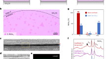 Figure 4a shows photoluminescence (PL) measurements (see Methods) of MoS2 domains transferred onto 90 nm SiO2 on Si substrates (solid line), compared to a monolayer exfoliated MoS2 crystal control sample (dashed line). Identical acquisition parameters and substrates were used in both cases. The intensity of the PL response is comparable in both cases, while the PL peak for transferred crystals is blue-shifted with respect to exfoliated samples. Electric field-effect measurements were performed on 100 µm × 100 µm unencapsulated devices of continuous MoS2 films transferred onto 300 nm SiO2 on Si substrates with pre-patterned contacts (see Methods). Four-point sheet conductivity σS was calculated at varying gate bias (VG) as described in ref. 29, with the results for a representative device shown in Fig. 4b. The device shows an on-off ratio of >104 over the gate bias range, and small maximum hysteresis of about 16 V. The low level of hysteresis suggests that the overall number of charge traps is low, including intrinsic charge traps within MoS2 itself30. The field-effect mobility µ was calculated using the formula31 \(\mu = (\mathrm {d}\sigma _{\mathrm{S}}/{\mathrm{d}}V_{\mathrm{G}}) \cdot 1/C_{ox}\), where Cox is the capacitance per unit area of the back gate. Our measured devices showed a range of µ between 5 and 30 cm2 V−1 s−1 (Supplementary Table 1), which is comparable to results for unencapsulated exfoliated MoS231.