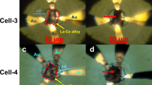 Our P–V data points are plotted in Fig. 2 together with literature data. The present data are less scattered thanks to the improved volume accuracy. The P–V data points are fitted with a third-order Birch–Murnaghan (BM) equation of state24, yielding the zero pressure volume V0, the bulk modulus B0, and its pressure derivative B0´. At 3 GPa, the volume of fcc phase is 41.80 Å3/formula. Because of the very similar volumes between CeH2 and CeH325, we have identified fcc phase as CeH3 rather than CeH2, because H2 is excessive in the chamber and the enthalpy calculations indicate that CeH3 has a lower enthalpy value than CeH2 (Supplementary Fig. 5). Above 72 GPa, the mixing curve of Ce+ 4/2 H2 (here we use reported EOS of Ce26 and H227) is in good agreement with our experimentally fitted compression curve of tetragonal phase, thus this phase is likely to have an CeH4 stoichiometry. For the second cubic phase from 40 to 72 GPa, its volume is close to cubic CeH3 at 40 GPa, however, the volume becomes close to tetragonal CeH4 at 72 GPa. In this pressure range, we can also intuitively see that the compression curve of second cubic phase is approaching the ideal mixing curve of Ce+ 4/2 H2 and connects the compression curves of CeH3 and CeH4 smoothly, indicating a process of hydrogen absorption from CeH3 to CeH4 (Supplementary Figs. 6 and 7). In the pressure range of 80–103 GPa, anomalous compressibility behavior of hexagonal phase is interpreted as an increase of the hydrogen concentration, corresponding to the ideal mixing curve of Ce+ 8/2 H2. Above 103 GPa, the fitted compression curve of hexagonal phase lies above the ideal mixing curve of Ce+ 8/2 H2 and below the ideal mixing curve of Ce+ 9/2 H2. The calculation of enthalpy in this pressure range shows that the hexagonal phase is in favor of CeH9.