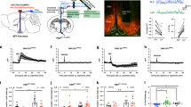 To map novel downstream sites of PVH neurons, we genetically target PVH neurons using previously described Sim1-Cre mice35. Four weeks after delivery of Cre-dependent adeno-associated viral (AAV) vectors engineered to express a channelrhodopsin (ChR2)-eGFP fusion protein (AAV-Flex-ChR2-eGFP) to the PVH of Sim1-Cre::ROSA-lsl-tdTomato mice (Fig. 1a, b), we assayed for ChR2 projections originating from Sim1 expressing PVH neurons in potential downstream target domains. Notably, we identified discrete GFP-expressing fibers in the ventral part of lateral septum (LSv) (Fig. 1c), a known brain region for fear and aggression34. The LSv region with GFP fibers was found to largely span from Bregma + 1.18 to +0.98 (Supplementary Fig. S1a–f). It is interesting to note that the LSv was the only region at these Bregma levels found to receive abundant PVH inputs (Supplementary Fig. S1g–j). To determine whether these projections were functional, we next recorded LSv neurons for excitatory postsynaptic currents (EPSCs) following photostimulation of ChR2-expressing hypothalamic fibers. 12 out of 18 recorded LSv neurons showed strong photo-induced postsynaptic responses, all of which were blocked by the glutamate receptor antagonists (CNQX/APV) (Fig. 1d), and refractory to the GABA-A receptor antagonist (GABAzine) (Fig. 1e) and AP4/TTX (Fig. 1f), suggesting that the PVH provides monosynaptic glutamatergic projections to LSv neurons. In the same preparation, we also recorded inhibitory IPSCs (12 out of 15), all of which were blocked by the GABA-A receptor blocker GABAzine (Fig. 1g). Surprisingly, IPSCs in most neurons were also blocked by CNQX/APV (10 out of 12) (Fig. 1h) and 4-AP/TTX (8 out of 12) (Fig. 1i). Moreover, the latency for IPSCs was significantly longer than that of EPSCs (Supplementary Fig. S1k). These data imply that the majority of recorded IPSCs were generated by activation of local GABAergic projections in response to photo-evoked PVH glutamatergic input. However, IPSCs from a small portion of neurons (4 out of 12) were partially blocked by TTX/4-AP (Fig. 1j), suggesting a minor portion of monosynaptic GABAergic projection. Supporting this, LSv neurons recorded in Sim1-Cre::Vglut2flox/flox mice, in which synaptic glutamate release is disrupted36, showed no photo-evoked EPSCs (data not shown) and only a small number of IPSCs (3 out of 25 recorded), which were resistant to TTX/4-AP (Fig. 1k). Consistently, when we delivered to wild type mouse LSv of a mixture of viral vectors containing AAV-DIO-mCherry and retro-AAV vectors AAVrg-Cre-Venus, which can be taken up by synaptic terminals and trace projection neurons37, a significant number of Venus-only neurons were found away from the injection site with mCherry-expressing neurons (Supplementary Fig. S1l), suggesting Venus-only neurons as local-projecting neurons. To validate the specificity of the connection between PVH and LSv, we ruled out a potential contribution from Sim1 neurons that reside in the nearby posterior hypothalamus (Supplementary Fig. S2). Taken together, these results suggest that local LSv GABAergic circuits receive direct PVH projections consisting of mainly glutamatergic, and a small portion of GABAergic input (Fig. 1l).