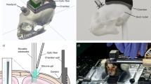 Stimulus presentation, behavioral monitoring, and reward presentation were synchronized and performed automatically using a custom-written program (OpenEX and Synapse, Tucker-Davis Technologies, USA) running on a workstation (WS-8 in combination with an RZ2 bioamp processor and RZ6D multi I/O processor, Tucker-Davis Technologies, USA) and a custom-written MATLAB program running on another PC, which was connected via an A/D interface card (PCIe 6321, National Instruments) with the workstation (Fig. 1a). A monitor screen connected to the desktop PC was positioned in front of the animal’s head at a distance of 40 cm for visual stimulus presentation. Vocalizations were recorded using a microphone (MKH 8020 microphone with MZX 8000 preamplifier, Sennheiser, Germany in combination with a phantom power, PAN 48.2, Palmer) positioned 10 cm in front of the monkey’s head and connected to a multi I/O processor (RZ6D, Tucker-Davis Technologies, USA). Vocalizations were recorded using the same system at a sampling rate of 100 kHz. Vocal onset times were detected offline using software (Avisoft-SASLab Pro 5.2.13, Avisoft Bioacoustics) to ensure precise timing for data analysis. The monkey’s behavior was constantly monitored using a USB video camera (Brio, Logitech) placed in front of the monkey.