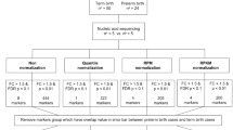 Prior to meta-analysis, SNPs with a minor allele frequency (MAF) <0.01 and poorly imputed SNPs (r2hat <0.3 from MACH50 or info <0.4 from SNPTEST48) were excluded. Furthermore, SNPs available in less than 50% of the discovery cohorts for each trait were excluded. To adjust for inflation in test statistics generated in each cohort, genomic control51 was applied once to each individual study (see Supplementary Table 6 for λ values in each study). The sub-samples within iPSYCH and SSI-GE were meta-analyzed separately first and estimates were then adjusted by genomic control again. Finally, we combined results from all discovery cohorts using fixed-effects inverse-variance-weighted meta-analysis as implemented in METAL52. Final meta-analysis results were obtained for 7,646,297 SNPs for gestational duration with a genomic inflation factor (λ) of 1.049, 7,588,467 SNPs for early preterm birth (λ = 1.005), 7,545,601 SNPs for preterm birth (λ = 1.013), and 7,583,965 SNPs for postterm birth (λ = 1.026). Heterogeneity between studies was estimated using the I2 statistic53. Combined analysis of the discovery and replication stage data was also conducted by fixed-effects inverse-variance-weighted meta-analysis. We considered SNPs with P < 0.05 in the replication stage and P < 5 × 10−8 in the combined analysis to indicate robust evidence of association.