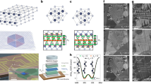 To understand the switching phenomena, we compute the potential energy landscape of MoTe2 using first-principles density functional theory (DFT) calculations51,52,53,54,55 (see Methods section). As shown in Fig. 1a, the P and M layers are related by the symmetry operation \(M_z|\left( {\frac{{\boldsymbol{b}}}{2} + {\mathrm{\lambda }}} \right)\), where \(M_z\), b and \({\mathrm{\lambda }}\) represent a vertical mirror, lattice vector, and the interlayer displacements between two neighboring layers, respectively. We identify a new high-symmetric orthorhombic structure T0 (Pnma, space group #62) of MoTe2 at λ = 0 (Fig. 1b), which belongs to the high-energy peak on the potential energy landscape of MoTe2 (Fig. 4d). The T0 phase has two instabilities: (1) an unstable in-plane optical phonon mode at the Brillouin zone center, and (2) an elastic instability yielding negative elastic stiffness coefficients (Supplementary Fig. 5). The first instability leads to an interlayer displacement of neighboring layers, yielding a double-well potential energy profile with two local minima at λ = ±0.5 Å, representing Td↑/Td↓ phases. The second instability causes a rigid shear of the orthorhombic unit cell, making the b-c cell angle non-orthogonal. By rotating the b-c angle of the T0 phase, we again obtain a double-well potential energy profile having two local minima at 86.4o and 93.6o corresponding to 1T´-I and 1T´-II phases, and the predicted monoclinic angle is in good agreement with the experimental data (93.5o−93.9o)33,41,56. This monoclinic distortion has the effect of shifting the neighboring layers horizontally, by about the same distance as in the Td phases, suggesting that it is driven by the same underlying microscopic instability.