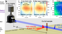 The experiment was performed at the PALS39 facility. The laser beam (\(350\ {\rm{ps}}\), \(700\ {\rm{J}}\), \(1.315\ \upmu {\rm{m}}\)) irradiated a \(1.5-\upmu {\rm{m}}\)–thick Cu foil at normal incidence. The laser beam profile and intensity distribution in the focal spot were characterized with calorimetric measurements of an attenuated beam. The spot profile was fit to a Gaussian function with \(1/\)e radius of \(58.5\ \ \upmu {\rm{m}}\), and the energy encircled within the focal spot was carefully measured38. The maximum on-axis laser intensity, calculated using the measured laser temporal profile and spatial distribution, was found to be \(4.55\times 1{0}^{15}\ {\rm{W}}\ {\rm{cm}}^{-2}\).