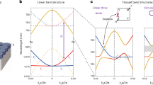 Next, we study topological phase transitions between Floquet Chern insulators and normal insulators and show these transition points are singular points in the parameter space of (kx, ky, Ω) as shown in Fig. 3a. First, the Floquet band gap closes at the transition point, but grows linearly as Ω deviates from Ω2 (Fig. 3b). Furthermore, we compare the Floquet spectra near the transition point: the bands are gapped when either Ω > Ω2 (left panel of Fig. 3d) or Ω < Ω2 (right); however, the two Floquet bands touch at a singular point in k space in a linear fashion when Ω = Ω2 (middle). We note the small difference between Ω2 and \(\Omega _{\mathrm{C}}^{\mathrm{E}}\) arises from the difference between full Floquet formulation we adopt here and results under rotating-wave approximation. The gap size grows linearly as the system parameter deviates from a single point in the three-dimensional parameter space of (kx, ky, Ω), therefore, the transition points can also be interpreted as synthetic Weyl points28,29,30,31. We further track the Chern numbers of the Floquet bands as Ω is varied: the Chern number of the top (bottom) band changes by −1 (1) as the modulation frequency reduced from Ω1a/2πc = 0.395 (Floquet normal insulator) to Ω3a/2πc = 0.37 (Floquet Chern insulator), through Ω2a/2πc = 0.383 (Fig. 3c). In addition, the Chern numbers of the two bands jump in opposite directions with their sum fixed at 0, which confirms our system is a Chern insulator. Similarly, the Floquet gap can also be closed and re-opened under linearly polarized driving fields. For example, by tuning Ω through a critical value of \(\tilde \Omega _2a/2\pi c = 0.375\), the Floquet gap is closed and re-opened, but at a pair of opposite k points. Through this process, all bands remain topologically trivial with zero Chern numbers due to the presence of T-symmetry.