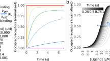 NSFA was performed on the decaying phase of currents evoked by 1 or 100 ms applications of 10 mM glutamate (35–300 successive applications), as previously described36. The variance for each successive pair of current responses was calculated and the single-channel current (i) and total number of channels (N) were then determined by plotting the ensemble variance (σ2) against mean current (\(\bar I\)) and fitting with a parabolic function: