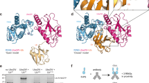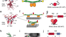 Based on the crystal structure, Ube2N~Ub should bind T21-R with higher affinity than Ube2N, due to the additional ubiquitin interactions (Fig. 2). Such behavior was observed for BIRC7 and Ube2D2~Ub9. To investigate this, we carried out a series of binding experiments using surface plasmon resonance (SPR), which allowed us to measure binding to the wild-type T21-R. We first measured a KD of 43 ± 5 µM (mean ± s.d. of two independent experiments) between immobilized GST-T21-R and Ube2N (Fig. 3a), which is slightly higher than the one measured by NMR under a different experimental setup and using T21-RM10E (see Methods section). Repeating the SPR measurement using Ube2N~Ub, we observed an increase in affinity by nearly an order of magnitude to a KD of 5 ± 1 µM (mean ± s.d. of three independent experiments; Fig. 3b). RING E3s enable catalysis by promoting the closed E2~Ub conformation8,9,10. To observe formation of the closed conformation in solution, we titrated 15N-T21-RM10E with Ube2N~Ub. Comparison with the titration of uncharged Ube2N revealed a small number of amide peaks with a different magnitude and direction of CSP (Fig. 3c, d). We calculated the differential chemical shift perturbation (dCSP, see Methods section) between the peaks of TRIM21 in the presence of either Ube2N or Ube2N~Ub in order to isolate the effects due to ubiquitin. The amides showing the strongest dCSP values are E12, V53, C54, and R55 (Fig. 3c), in agreement with the two interfaces between ubiquitin and the proximal RING observed in the crystal structure (Fig. 2). The distal interface cannot be observed in these experiments, as monomeric T21-RM10E was used. To confirm formation of the closed conformation in these experiments, we also titrated T21-RM10E into Ube2N~15N-Ub (Supplementary Fig. 5). Indeed, amide CSPs could be observed on ubiquitin at interfaces present in the closed Ube2N~Ub conformation (Supplementary Fig. 5d–f).