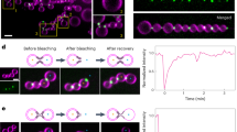 Imaging was performed at 34–37 °C on an Olympus microscope (Olympus IX71 or IX83) equipped with an inverted Apochromat ×60 oil objective of numerical aperture 1.49 in combination with a ×1.6 magnifying lens; or with a ×100 objective of numerical aperture 1.49 (Olympus). Samples were excited in TIRF illumination (Olympus IX2RFAEVA illuminator) with a 473 nm laser source (Cobolt). Emitted fluorescence was filtered with a 525/50 m filter (Chroma Technology). Images were acquired by an electron multiplying charge coupled device camera (EMCCD QuantEM:512SC, Roper Scientific) controlled by the software MetaVue 7.8 (Molecular Devices). Two-colour imaging was performed with a co-aligned 561 nm laser (Cobolt) with the same TIRF angle as the 473 nm laser. Emitted fluorescence was filtered with a 605/52 m filter (Chroma Technology). Red and green fluorescence images were obtained 200 ms apart using a filter wheel (Lambda 10-3, Sutter Instruments). To correct for x/y distortions between the two channels, images of fluorescently labelled beads (Tetraspeck, 0.2 μm; Invitrogen) were taken before each experiment and used to align the two channels. Time lapse images were acquired at 0.5 Hz with an integration time of 100 ms.