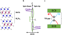 Apart from bulk carrier suppression, another precondition for QAHE is spontaneous magnetization, thus it is necessary to investigate systematically the magnetism of this material family. We use a vibrating sample magnetometer to measure the magnetization of bulk crystals with different values of x. Figure 3a shows the field-cooled (FC) and zero-field-cooled (ZFC) curves of four samples for x = 0 to 0.5. The FC and ZFC curves of each sample perfectly overlap with each other and a peak near 25 K can be identified, indicating an AFM transition in all four samples from x = 0 to 0.5. In the curves of magnetization versus B field displayed in Fig. 3b and the transport magnetoresistances (Fig. 3c) of the samples with different x values (as well as in ρxy discussed above in Fig. 2g), two types of “kink” feature (marked by the arrows and triangles in Fig. 3b, c, respectively) can be identified near B = 3T and 7T in all four samples. This can be explained by an AFM to canted-AFM (CAFM) transition (Hc1 ~ 3T) and a CAFM to FM transition (Hc2 ~ 7T) caused by the external magnetic field36. One further phenomenon of interest is that when increasing the magnetic field, the magnetoresistance of the sample with x = 0.25 jumps upwards at the first kink near Hc1 ~ 3T, as shown in Fig. 3c, which is the opposite of the case for the other three samples. The reasons for this are worthy of further study and may be attributable to the different magnetic coupling mechanisms between the sample with strong metallic behavior and that with the Fermi level near the band gap46,47,48. Figure 3d summarizes the results of Néel temperature extracted from the magnetization data in Fig. 3a and the corresponding critical field for the kink (Hc1, Hc2) in Fig. 3b, c. Both TN and the critical field decrease with increasing x, indicating the weaker AFM coupling in samples with higher x. However, the increase in antimony does not much affect the order of AFM because TN only decreases by 2.6 K in the sample for x = 0.5 compared with the one for x = 0. We therefore believe that there is no magnetic transition from AFM to paramagnetism and the spontaneous magnetization is maintained in Mn(SbxBi1 − x)2Te4 within the range of x < 0.5. In fact, spontaneous AFM order still maintains when x = 1, i. e. in pure MnSb2Te449.