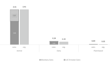 Figure 3 gives the aggregated national emissions. It shows that the direct emissions associated with organic crop (Fig. 3a) and livestock (Fig. 3c) production are smaller for organic farming compared with conventional: by 20% for crops, 4% for livestock and 6% overall. This is a slightly lower estimate of the effect of conversion to organic farming than in Audsley et al.’s study14. The decrease occurs despite an increase in transport emissions, illustrating the relatively small contribution that transport makes to agriculture’s total GHG budget23.