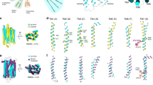 For consistency, all analyses of the simulations are based on the time windows from 1400 to 1800 ns in each simulation. We analyzed water and ion density distributions in the MD trajectories using GROmaps77 and MDAnalysis78 and calculated electrostatic potential distributions from the charge densities in the MD simulations using the Poisson equation as implemented in PMEPot79. Pore radii were calculated using HOLE80 for an ensemble of conformations observed in the MD trajectories. Water, Na+, and Cl− distributions in the free MD simulations were analyzed to calculate potential of mean force profiles along the pore axis via \(G\left( z \right) = - RT\ln\frac{{n\left( z \right)}}{{n_{{\mathrm{{bulk}}}}}}\), where G is the free energy, T the temperature, and R the gas constant. Densities were analyzed within a cylinder placed along the pore axis with a radius of 36.23 Å (resulting in a cross-sectional area identical to the area of OLPVRII in the membrane plane); n(z) is the density within a membrane slice at axial position z, and nbulk is the density in the bulk phase. We calculated standard deviations of energies and pore radii using block bootstrap sampling.