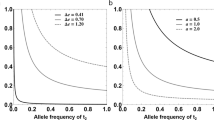 Unless stated otherwise, we perform simulations with strong choosiness in genotypes FF and MM (\({\epsilon }_{\text{f}}=0.01\), \({\epsilon }_{\text{m}}=0.01\)). We also set \(s^{\prime} =0.5\) to ensure that polymorphism at the ecological locus \({{A}}\) is maintained. Simulations start with only alleles f and m present in the population. Once the population has reached ecological equilibrium, 1% of choosy males and females are introduced at Hardy–Weinberg equilibrium, such that choosiness alleles are in linkage equilibrium with each other and with alleles at the ecological locus.