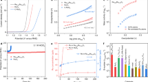 Inspired by the excellent acidic OER performance, we conducted the test of overall water splitting in a two-electrode configuration to directly mimic the PEMWE. The Ru-N-C and commercial Pt/C were used as the anode and cathode, respectively, with the device shown in Supplementary Fig. 13. The amounts of evolved H2 and O2 gas were quantified by means of gas chromatography (Supplementary Fig. 14). Obviously, the Ru-N-C||Pt/C combination exhibits highly full-water splitting activity with mean O2 and H2 evolution rate up to 52 and 104 mmol h−1 cmg−2 (where cmg2 is the electrode area) under the applied voltage of 1.5 V vs. RHE in Fig. 2f, respectively. The quantitative Faradaic gas evolution was at the predicted 2:1 ratio for H2 to O2, within experimental error. Moreover, the electrolyzer can work continuously for 24 h to produce H2 and O2 gaseous products without notable degradation. Considering the exceptional activity and high stability in acidic media, as well as the low cost, the Ru-N-C electrocatalyst may be highly competitive for potential large-scale industrial applications.